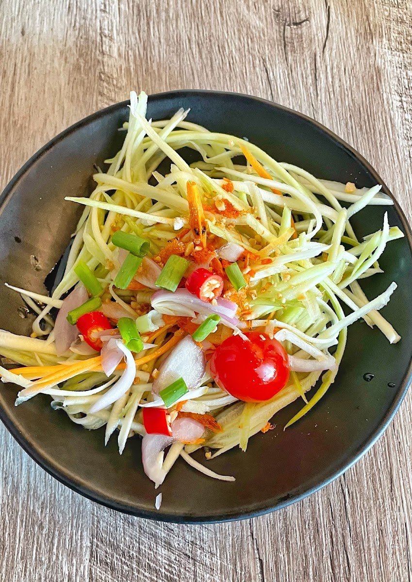 For those looking for a bold and exciting starter, the Green Mango Salad is a must-try. This dish combines the tangy freshness of green mango with spicy, sour, and savory elements, creating a delightful explosion of flavors. It's a perfect introduction to the unique blend of Thai spices and quality meats that the restaurant offers.