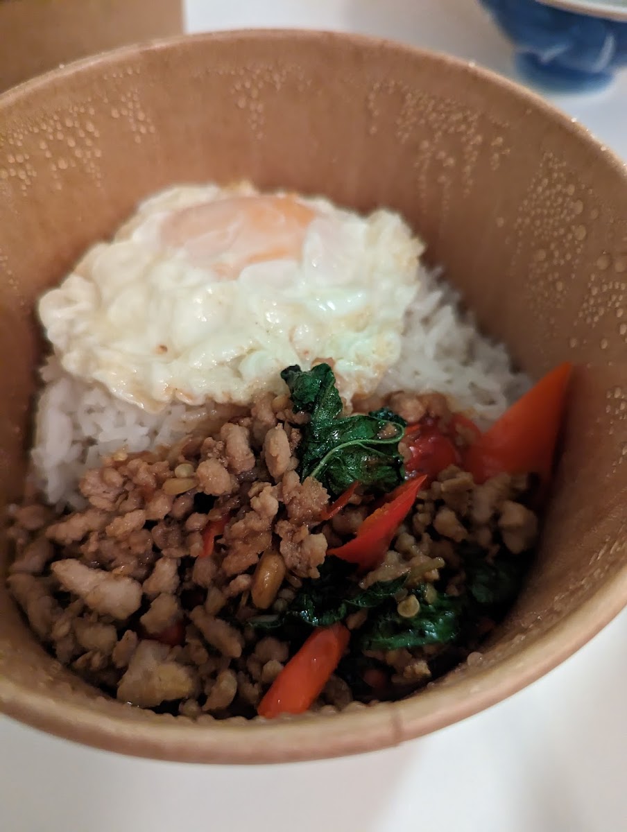 The Basil Minced Pork w Rice & Egg is a classic Thai dish that’s packed with rich, savory flavors. The minced pork is stir-fried with fragrant basil leaves, chili, and a hint of fish sauce, served over rice and topped with a perfectly fried egg. It's a crowd favorite for its authenticity and satisfying combination of tastes.